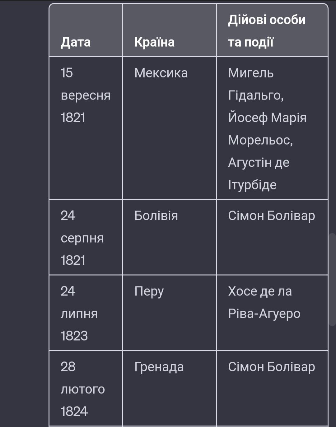 ДОПОМОЖІТЬ БУДЬ ЛАСКА З ІСТОРІЄЮ ДАЮ 100 БАЛІВ 2. Складіть таблицю "Утворення незалежних держав Латинської Америки" (колонки: Дата - Країна- Дійові особи та події)