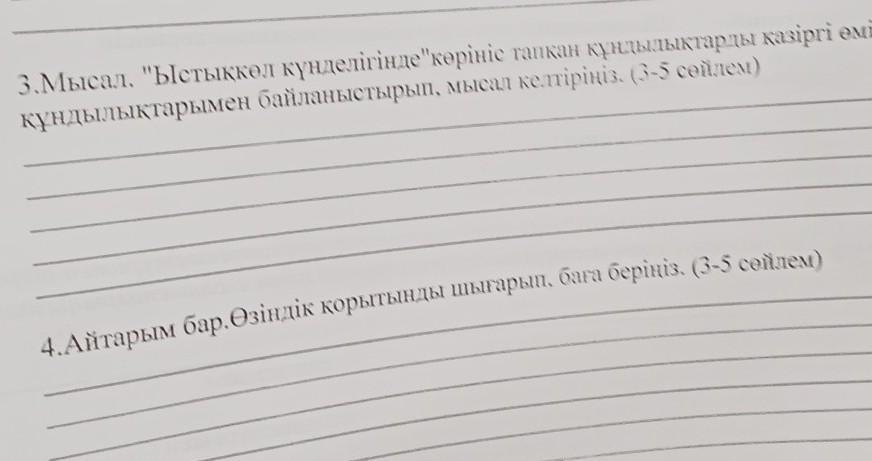 3.Мысал. "Ыстыккел күнделігінде көрініс тапкан құндылықтарды қазіргі өмір құндылықтарымен байланыстырып, мысал келтіріңіз. (3-5 сейлем).