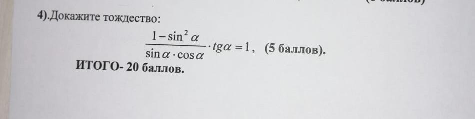 Смотри фото 4).Докажите тождество: 1-sin² a sin a.cos a ИТОГО-20 балалар ово .tga =1, (5 баллов).