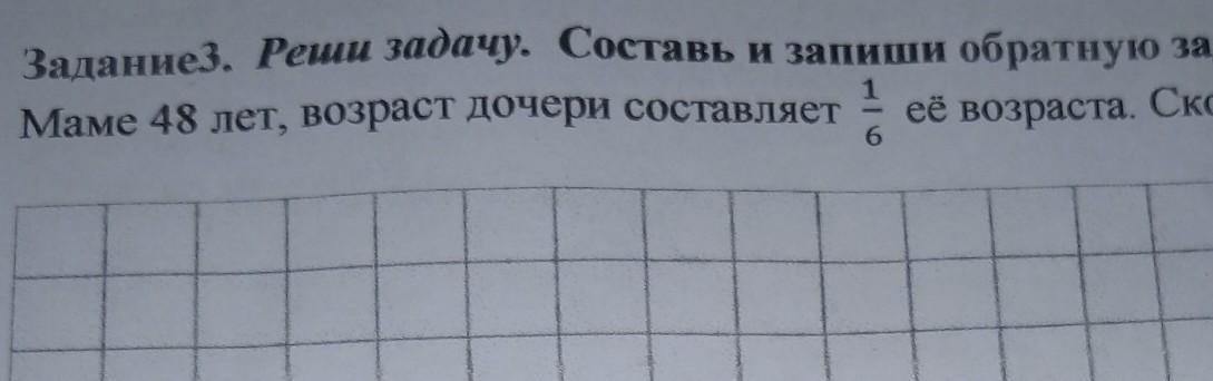 составь и запиши обратную задачу маме 48лет возвраст дочери составляет 1/6 ее возвраста. сколько лет дочери.
