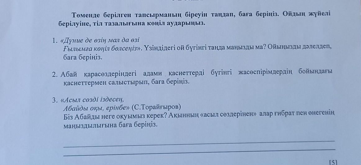 Төменде берілген тапсырманын бiреуiн тандап, баға беріңіз. Ойдың жүйелі берiлуiне, тіл тазалығына көңіл аударыңыз. 1. «Дүние де өзін мал да өзі Ғылымға көңіл болсеңіз». Үзіндідегі ой бүгiнгi танда маңызды ма? Ойынызды дəлелдеп, баға беріңіз. 2. Абай карасөздеріндегі адами қасиеттерді бүгінгі жасөспірімдердің бойындағы касиеттермен салыстырып, баға беріңіз. 3. «Асыл созді іздесең, Абайды оқы, ерінбе» (С.Торайғыров) Бiз Абайды неге окуымыз керек? Акынның «асыл сөздерінен» алар ғибрат пен өнегенін маңыздылығына баға беріңіз. Пже