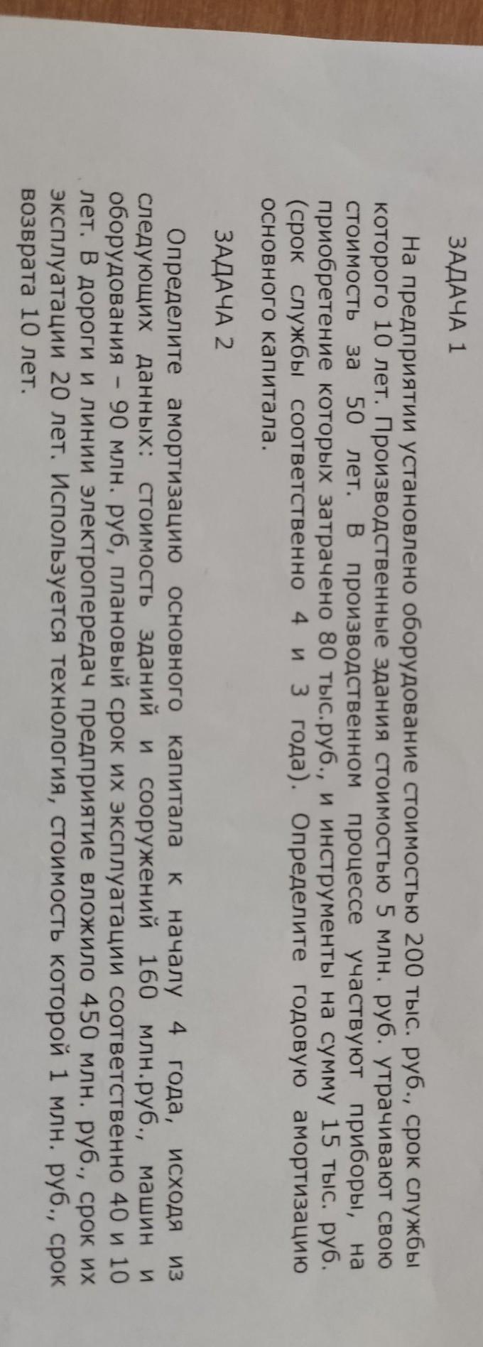 ЗАДАЧА 1 На предприятии установлено оборудование стоимостью 200 тыс. руб., срок службы которого 10 лет. Производственные здания стоимостью 5 млн. руб. утрачивают свою СТОИМОСТЬ за 50 лет. в производственном процессе участвуют приборы, на приобретение которых затрачено 80 тыс.руб., и инструменты на сумму 15 тыс. руб. (срок службы соответственно 4 и 3 года). Определите годовую амортизацию основного капитала. ЗАДАЧА 2 Определите амортизацию основного капитала к началу 4 года, исходя из следующих данных: стоимость зданий и сооружений 160 млн.руб., машин и оборудования - 90 млн. руб, плановый срок их эксплуатации соответственно 40 и 10 лет. В дороги и линии электропередач предприятие вложило 450 млн. руб., срок их эксплуатации 20 лет. Используется технология, стоимость которой 1 млн. руб., срок возврата 10 лет.