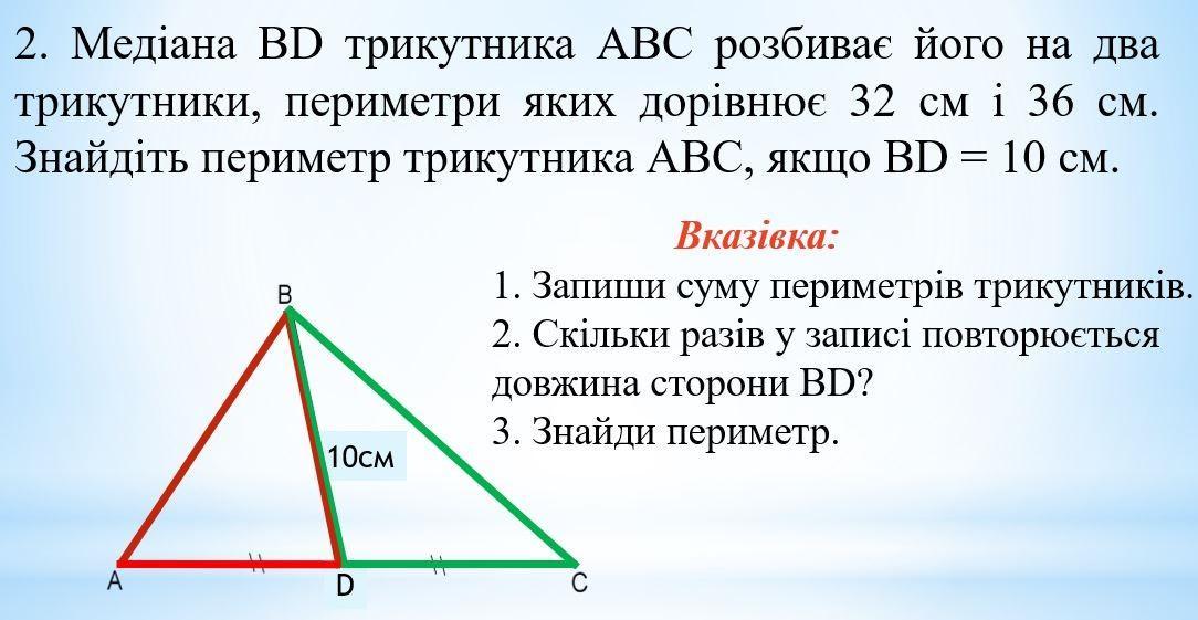 Медіана BD трикутника ABC розбиває його на два трикутники, периметри яких дорівнюють 32 см і 36 см. Знайдіть периметр трикутника ABC, якщо BD = 10 см.