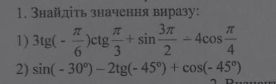 І варіант 1. Знайдіть значення виразу: П Зл T 1) 3tg( - )ctg - 4cos² 4 6 2 2) sin( - 30º) - 2tg(- 45º) + cos(- 45°) П -)ctg+sin- 3