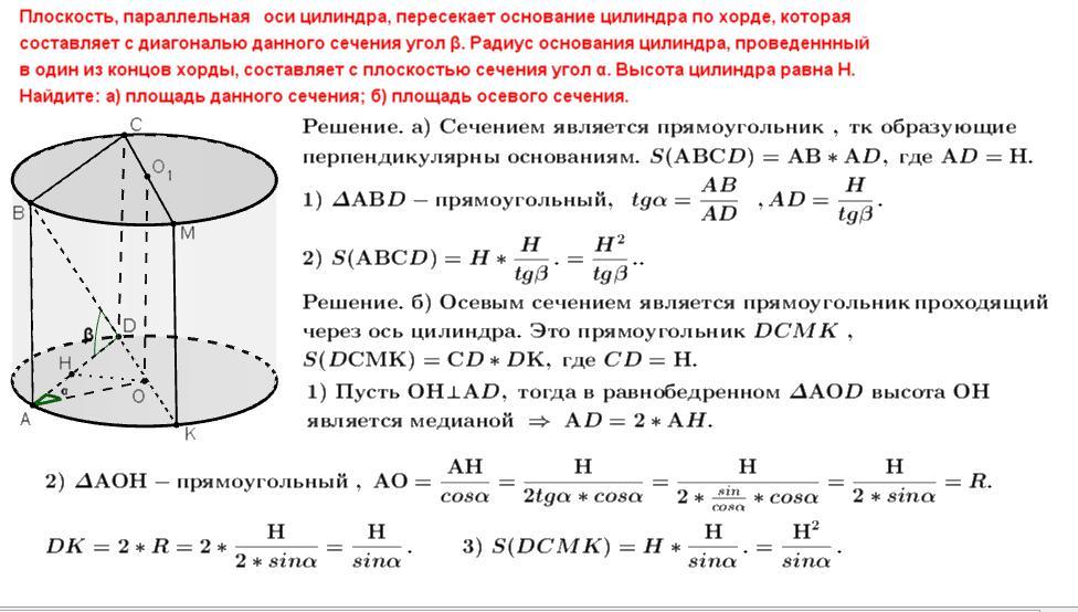 в один из концов хорды, составляет с плоскостью сечения угол α. Высота цилиндра равна Н.