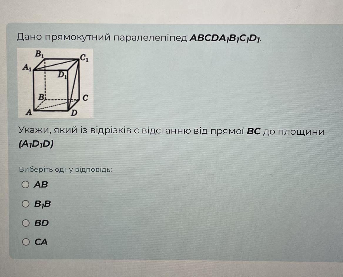Укажи, який із відрізків є відстанню від прямої BC до площини (А1D1D)