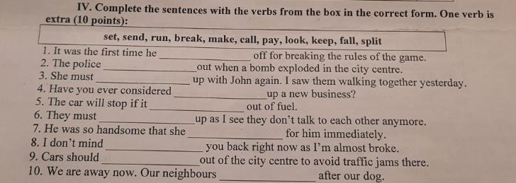 10. We are **sending** away now. Our neighbours **will look** after our dog.