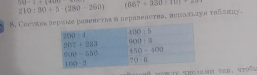 8. Составь верные равенства и неравенства, используя таблицу. 400:5 900:3 450-400 70-6 200:4 207-233 900-550 100-3