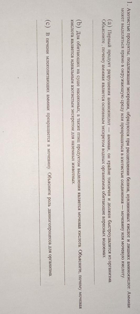 2. Обитатели суши, особенно насекомые и большинство пресмыкающихся, которые живут в условиях постоянного недостатка воды,продуктом обмена азотсодержащих органики является мочевая кислота, которая выводтся из организма в виде белых кристаллов, для изв выведения вода не требуется, т.к. она в воде не растворяется