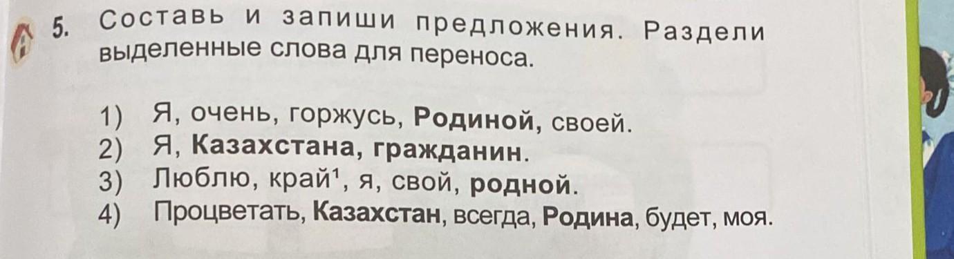 DAX 5. Составь и запиши предложения. Раздели выделенные слова для переноса. 1) Я, очень, горжусь, Родиной, своей. 2) Я, Казахстана, гражданин. 3) люблю, край¹, я, свой, родной. 4) Процветать, Казахстан, всегда, Родина, будет, моя. каки ПОМАГИТЕ ПОЖАЛУЙСТА