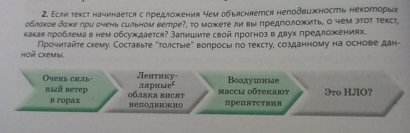 100 БАЛЛОВ 2. Если текст начинается с предложения Чем объясняется неподвижность некоторых облаков даже при очень сильном ветре?, то можете ли вы предположить, о чем этот текст, какая проблема в нем обсуждается? Запишите свой прогноз в двух предложениях. Прочитайте схему. Составьте "толстые" вопросы по тексту, созданному на основе данной схемы.