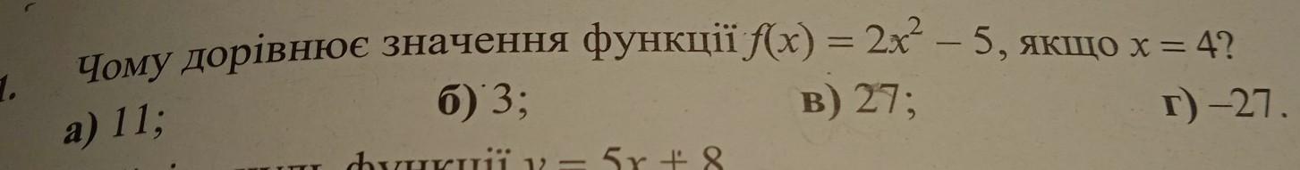 1. Початковий рівень Чому дорівнює значення функції f(x) = 2x² - 5, якщо x = 4? - 6) 3; a) 11: B) 27; г) -27. 5x+8