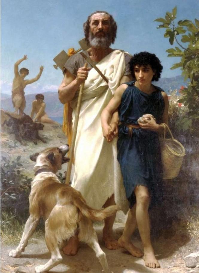 Завдання Розглянь картину французького художника Адольфа-Вільяма Бугро «Гомер та його поводир» (1874 р.). Яким побачив Гомера митець? Які риси поета вiн підкреслив? А якими рисами наділив хлопчика-поводиря? Що, на твою думку, символізує зображений на картині бродячий пес, який перегородив дорогу? СРОЧНОООО