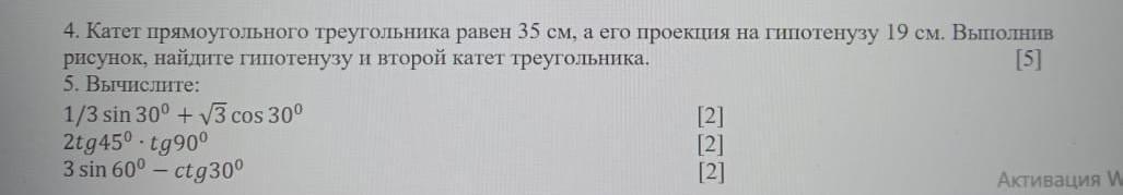 4. Катет прямоугольного треугольника равен 35 см, а его проекция на гипотенузу 19 см. Выполнив рисунок, найдите гипотенузу и второй катет треугольника.