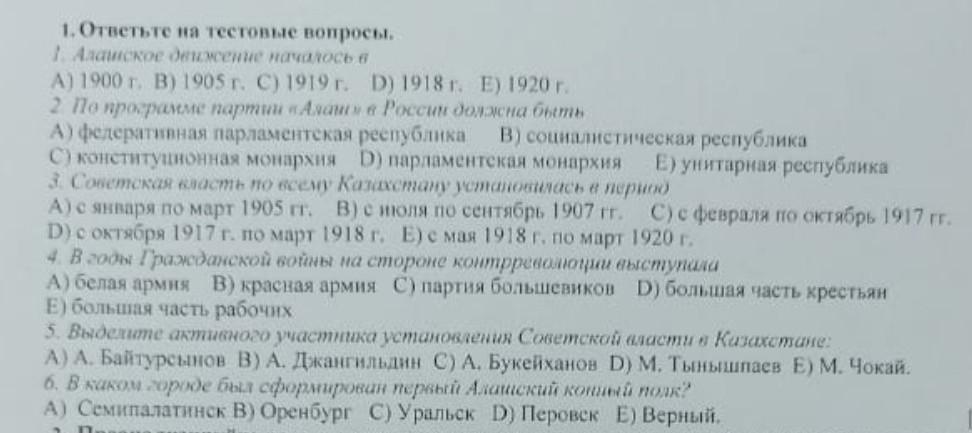 1. Ответьте на тестовые вопросы. Алашское движение началось в ) 1900 г. В) 1905 г. C) 1919 г. D) 1918 г. E) 1920 г. По программе партии «Алашм в России должна быть федеративная парламентская республика В) социалистическая республика конституционная монархия D) парламентская монархия E) унитарная республика Советская власть по всему Казахстану установилась в период 2) с января по март 1905 гг. В) с июля по сентябрь 1907 гг. с октября 1917 г. по март 1918 г. Е)с мая 1918 г. по март 1920 г. C) с февраля по октябрь 1917 гг. В годы Гражданской войны на стороне контрреволюции выступала белая армия в) красная армия С) партия большевиков D) большая часть крестьян большая часть рабочих Выделите активного участника установления Советской власти в Казахстане: А. Байтурсынов В) А. Джангильдин С) А. Букейханов D) М. Тынышпаев Е) М. Чокай. В каком городе был сформирован первый Алашский кой п Семипалатинск В) Оренбург C) Уральск D) Перовск Е) Верный. Проанализируйте роль и деятельность одного из представителей казахской интеллигенции о следующим критериям: [6]