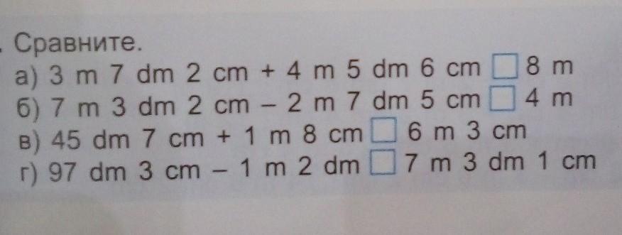 5. Сравните. a) 3 m 7 dm 2 cm + 4 m 5 dm 6 cm 6) 7 m 3 dm 2 cm - 2 m 7 dm 5 cm B) 45 dm 7 cm + 1 m 8 cm r) 97 dm 3 cm - 1 m 2 dm 6 m 3 cm 7 m 3 dm 1 cm 8 m 4 m
