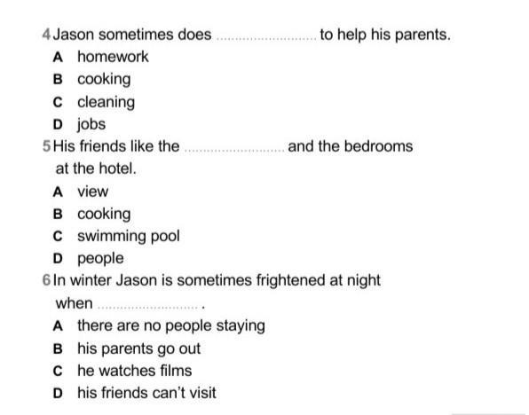 1. Jason sometimes does jobs to help his parents, 2. His friends like swimming pool and bedrooms at the hotel, 3. In winter Jason is sometimes frightened at night when there are no people staying.