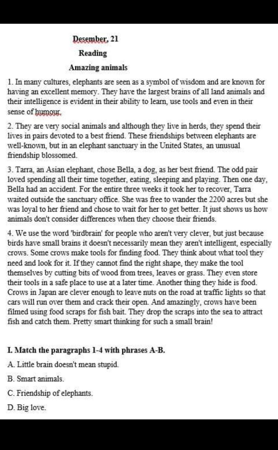 II. Put "+" or "" 1. Elephants are a symbol of freedom in many cultures of the world. 2. Elephants have a wonderful memory. 3. The largest brains of all land animals are in elephants. 4. As a rule elephants live in pairs. 5. In Asia an elephant chose a dog, as her best friend. 6. The amazing pair isn't fond of spending time together, sleeping and playing. 7. Once an elephant had an accident. 8. Animals don't consider differences when they have got real friends. III. Choose the correct answer. 1. Elephants have got an excellent... a) brain b) memory c) friends 2. Intelligence of elephants is evident in their ability to.... a) use tools b) paint c) remember 3. An unusual friendship blossomed in... a) Great Britain b) the USA c) Asia 4. Bella is... a) an elephant b) a dog c) a girl 5. When the friend had an accident Tarra decided to ... a) be free to wander b) go away c) wait for her 6. They say the word 'birdbrain' for people who are ... a) clever b) small c) stupid 7. Some crows can... a) look for tools b) make food 8. Crows drop the food scraps into the water.... a) to catch fish b) to hide food Оля Пересунько 9 Ч. НАЗАД c) live for a hundred year c) to have fun