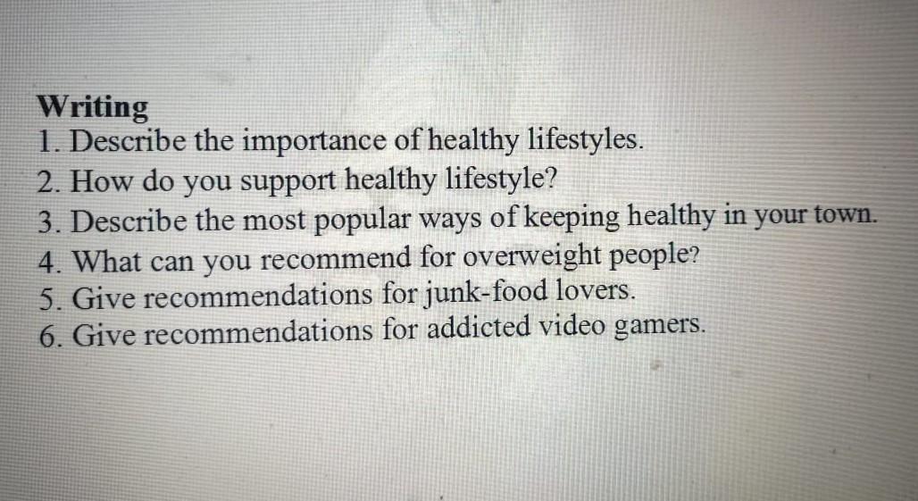 3. In my town, some of the most popular ways of keeping healthy include: Eating a balanced diet rich in fruits and vegetables. Exercising regularly, such as going for walks or doing yoga. Participating in outdoor activities like tennis or basketball. Practicing mindfulness and relaxation techniques, like meditation and deep breathing. Limiting stress through activities such as reading. Maintaining a good sleep schedule and getting enough rest.