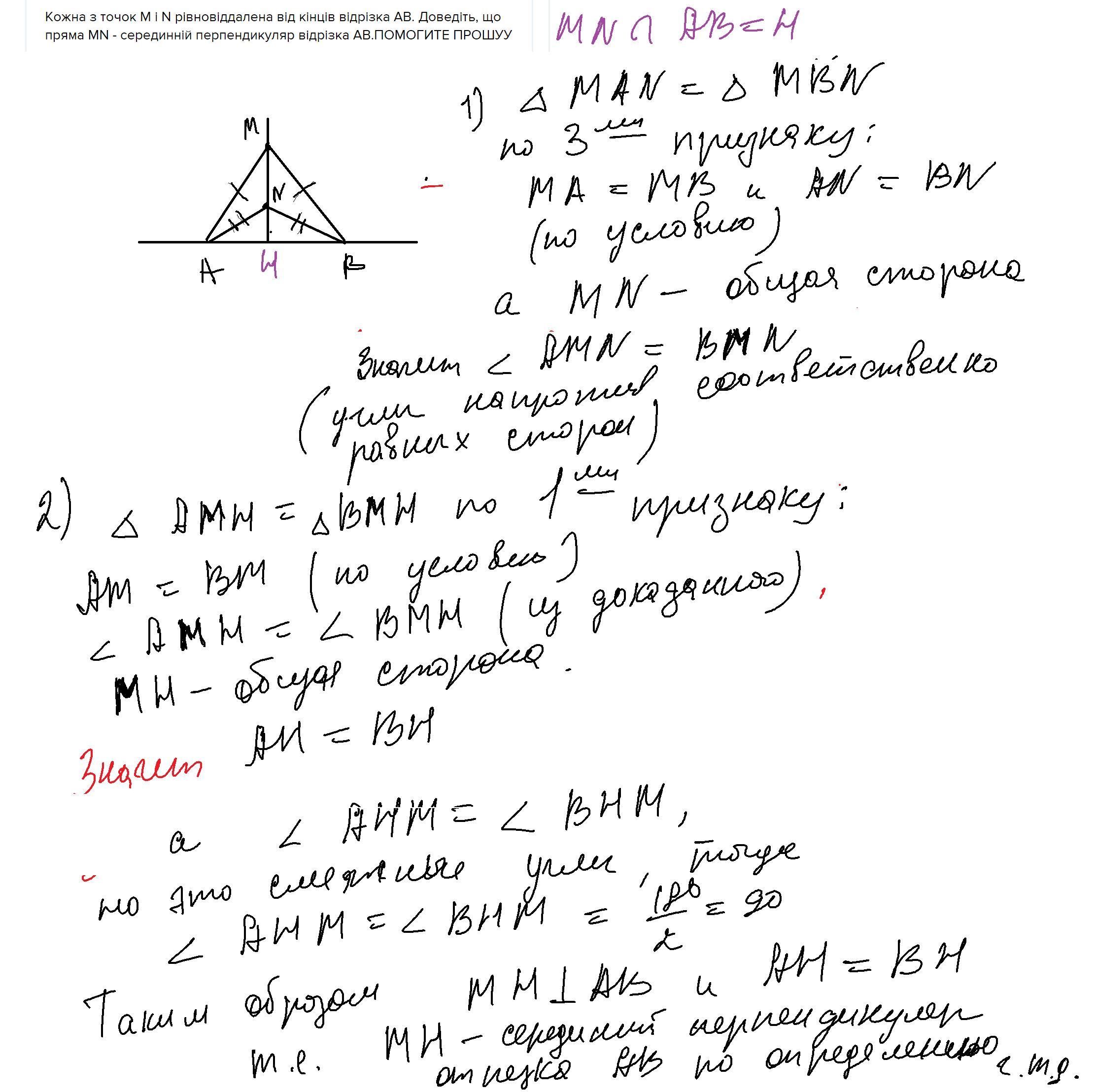 Кожна з точок М і N рівновіддалена від кінців відрізка АВ. Доведіть, що пряма MN - серединній перпендикуляр відрізка AB.ПОМОГИТЕ ПРОШУУ