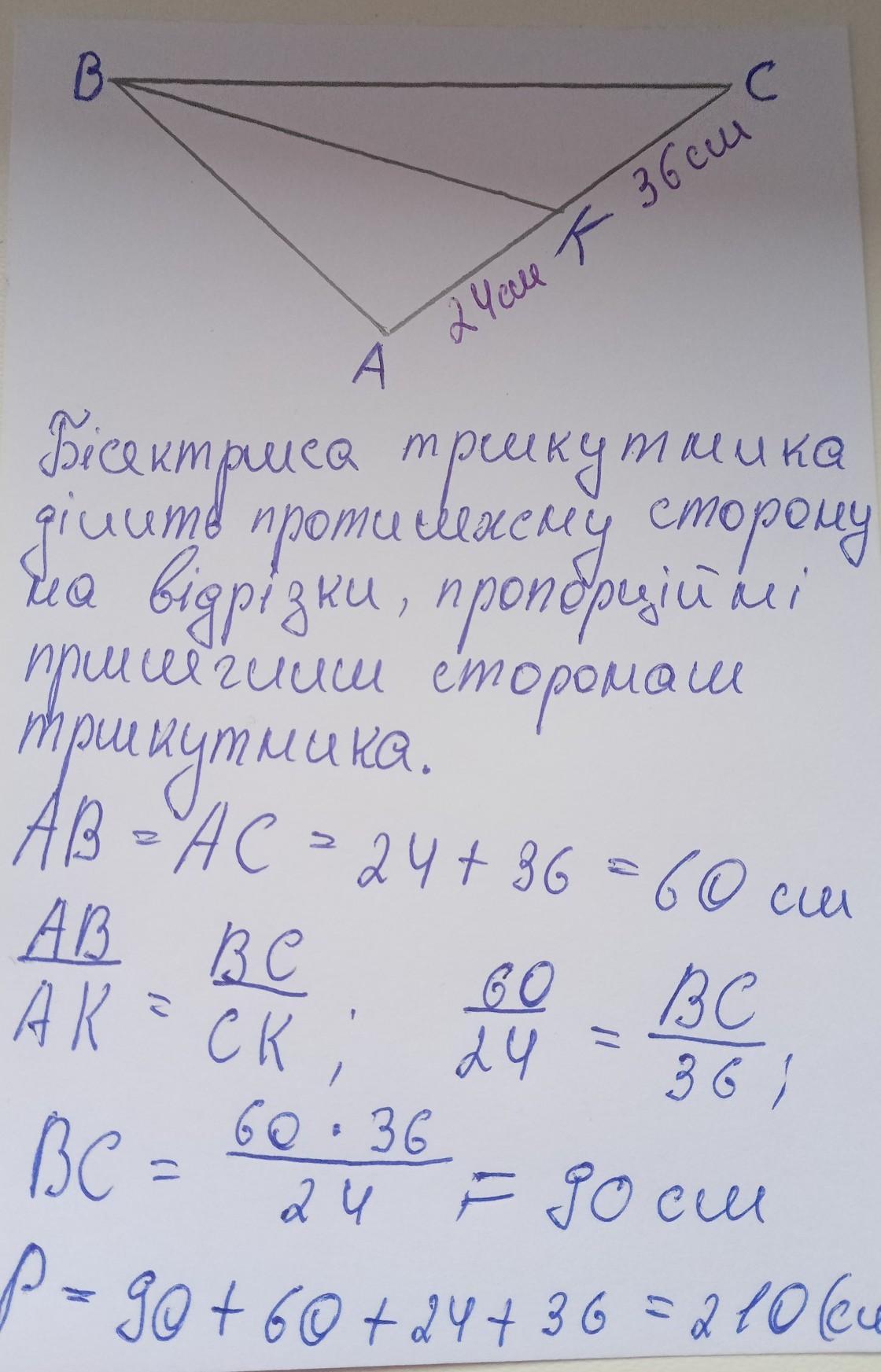 4.У рівнобедреному тупокутному трикутнику бісектриса ділить бічну сторону на відрізки завдовжки 24см і 36см. Знайдіть периметр трикутника.