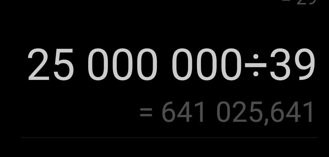 Ответ на вопрос 25000000:39 =641025.6 в остатке