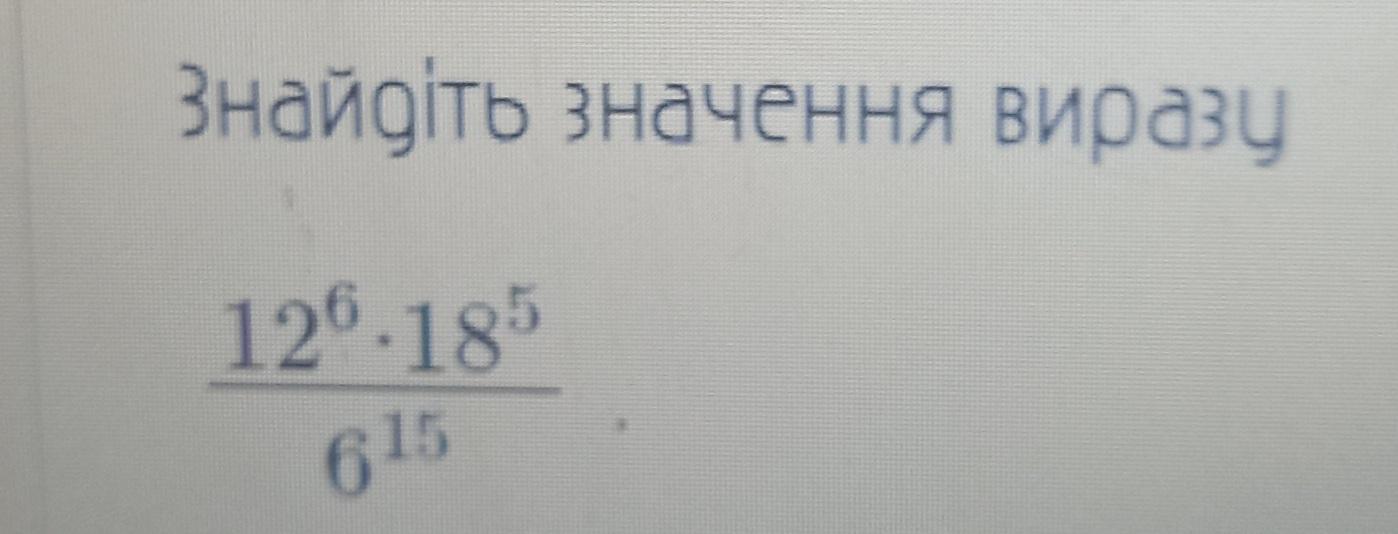 \displaystyle \frac{12^6\cdot 18^5}{6^{15}}=\frac{(2^2\cdot3)^6\cdot (2\cdot3^2)^5}{(2\cdot 3)^{15}}=\\\\\frac{(2^2)^6\cdot 3^6\cdot 2^5\cdot(3^2)^5}{2^{15}\cdot 3^{15}}=\frac{2^{12}\cdot 3^6\cdot 2^5\cdot3^{10}}{2^{15}\cdot 3^{15}}=\\\\\frac{2^{17}\cdot 3^{16}}{2^{15}\cdot 3^{15}}=2^2\cdot 3=4\cdot3=12