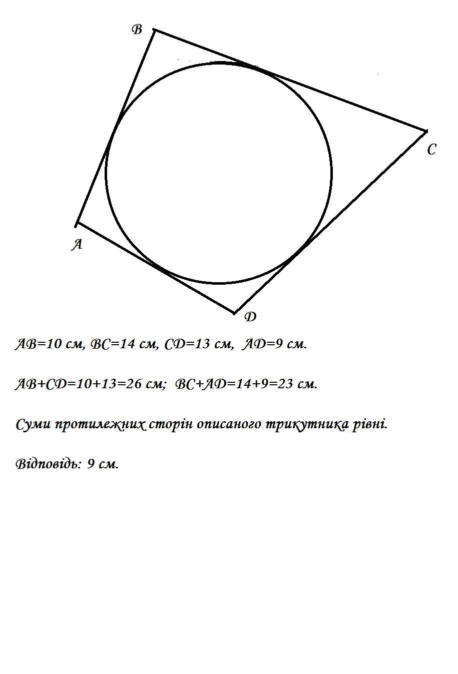 Накресліть коло з центром О і проведіть до нього чотири до- тичні так, щоб при їх попарному перетині утворився описаний чоти- рикутник ABCD. Виміряйте довжини сторін AB, BC i CD цього чотирикутника. Користуючись властивостями описаного чотирикут- ника, обчисліть довжину сторони AD. Перевірте отриманий резуль-