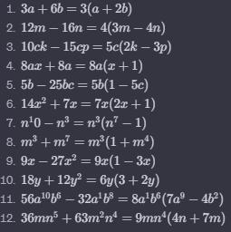 434.° Розкладіть на множники: 1) 3a +6b: 2) 12m-16n; 3) 10ck-15cp; 4) 8ax + 8а; 5) 5b - 25bc; 6) 14x² +7x; 7) n1o - n³; 8) m³ + m7; 9) 9x-27x*; 10) 18y +12y¹; 11) 56a¹0b6-32a¹b8; 12) 36mn5 +63m²n®. пжжж даю 30 балов!!!