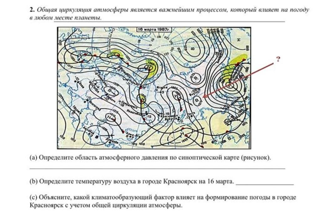 (с) Объясните, какой климатообразующий фактор влияет на формирование погоды в городе Красноярск с учетом общей циркуляции атмосферы.