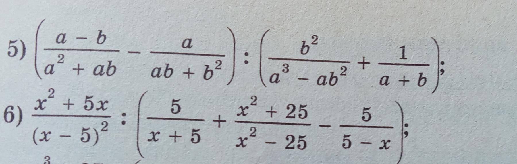 \( \frac{x^2+5x}{(x-5)^2} : \left( \frac{5}{x+5} + \frac{x^2+25}{x^2-25} - \frac{5}{5-x} \right) = \frac{x^2+5x}{(x-5)^2} : \left( \frac{5}{x+5} + \frac{x^2+25}{(x+5)(x-5)} - \frac{5}{x-5} \right) \)