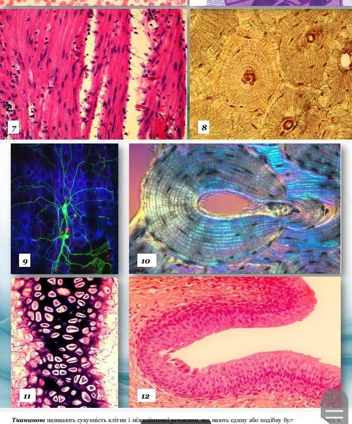 Відповідь: 7 схоже на м'язову тканину. 8 та 10 - це кісткова тканина. 9 - нервова. 11 навіть не знаю що це може бути. 12 це епітелій, який саме - складно сказати. Але схоже на перехідний або ж на війчастий, але скоріш за все перехідний, адже війок я там не бачу