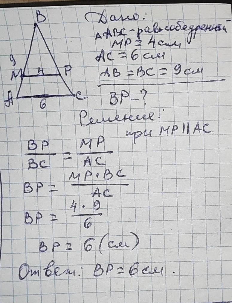 4. У рівнобічному трикутнику ABC AC-основа, АС= 6см, AB = 9см. Через бічні сторони паралельно основі проведено пряму, яка перетинає сторони AB i AC у точках М і Р відповідно. MP = 4см. Знайдіть ВР
