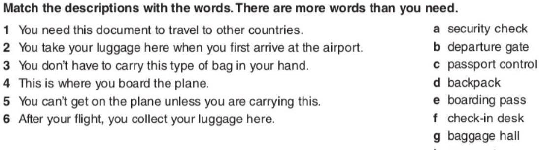 1 You need this document to travel to other countries. c passport control 2 You take your luggage here when you first arrive at the airport. f check-in desk 3 You don’t have to carry this type of bag in your hand. d backpack 4 This is where you board the plane. b departure gate 5 You can’t get on the plane unless you are carrying this. e boarding pass 6 After your flight, you collect your luggage here. g baggage hall