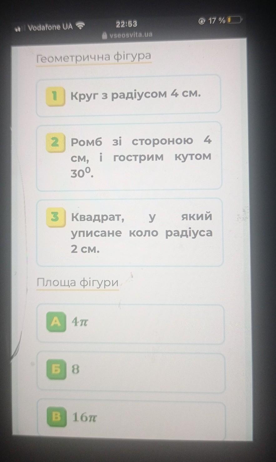 СРОЧНО ПОЖАЛУЙСТА Геометрична фігура 1 Круг з радіусом 4 см. 2 Ромб зі стороною в см, і гострим кутом 30⁰. 3 Квадрат, У який уписане коло радіуса 2 CM. Площа фігури A4т Б 8