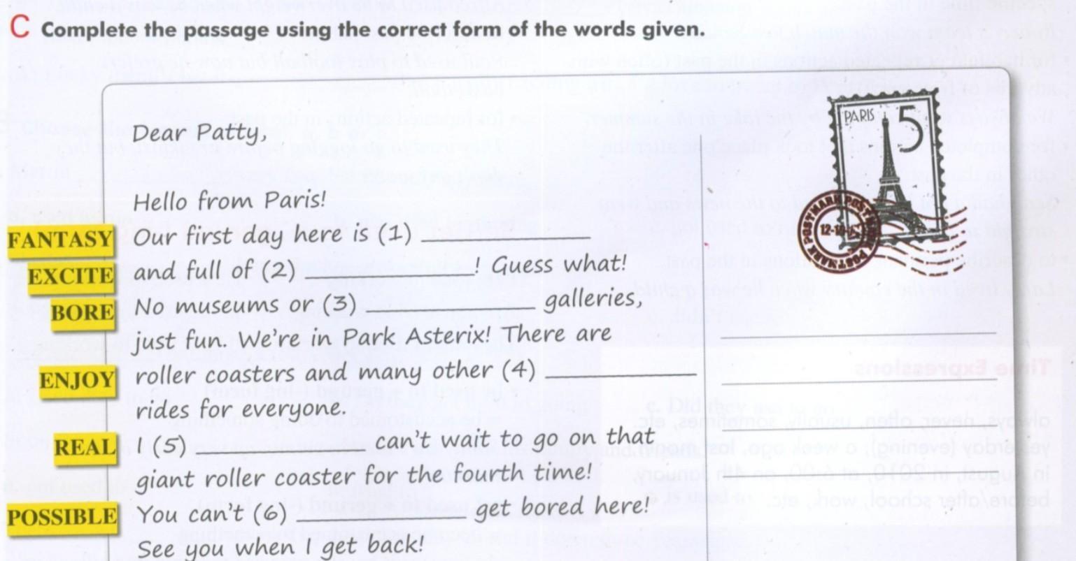 Dear Patty, Hello from Paris! (FANTASY)Our first day here is fantastic (EXCITE)and full of excitement! Guess what! (BORE)No museums or boring galleries, just fun. We’re in Park Asterix! There are (ENJOY)roller coasters and many other enjoyable rides for everyone. (REAL)I really can’t wait to go on that giant roller coaster for the fourth time! (POSSIBLE)You can’t possibly get bored here! See you when I get back!