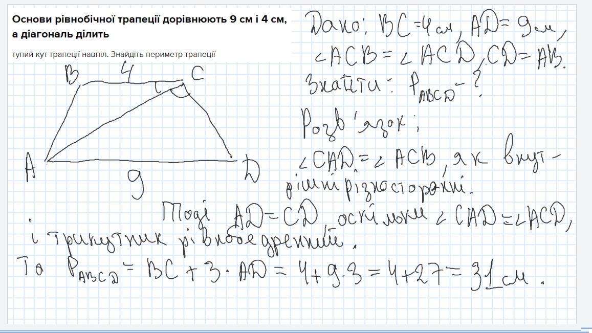 тупий кут трапеції навпіл. Знайдіть периметр трапеції