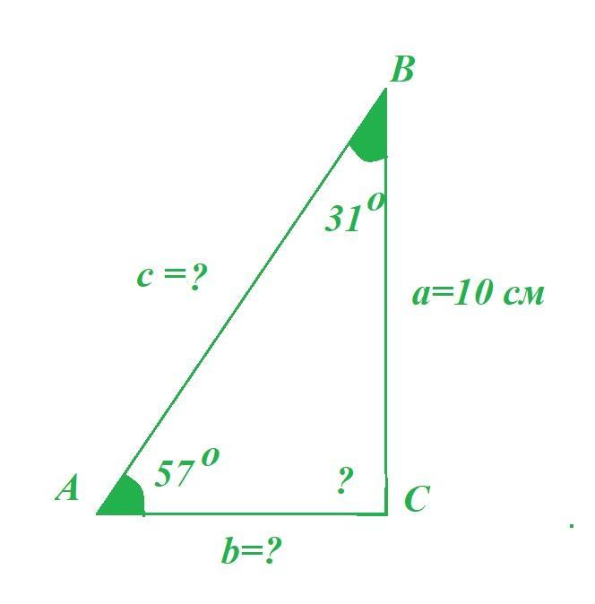 b=a*sinB/sinA = 10*sin31/sin57 = 10* 0.515/0.839 = 6.14 см.