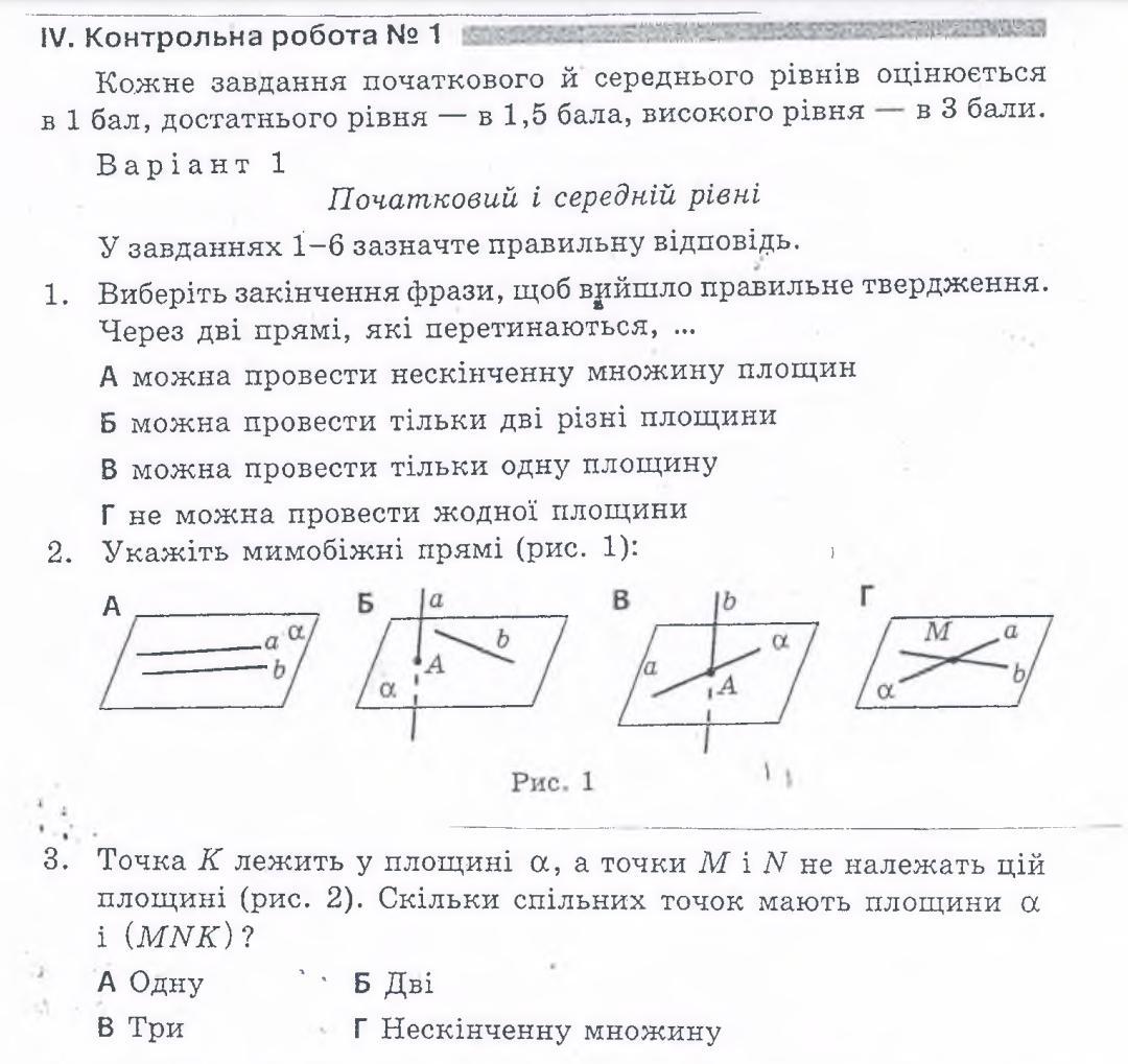 1) Это условие равносильно для плоскости по трём точкам - одна общая (точка пересечения) и по одной на каждой прямой.