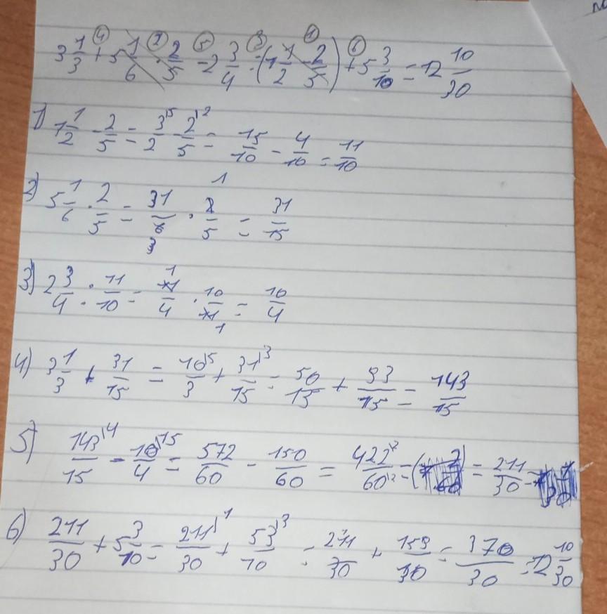 (3 целых 1/3+ 5 целых 1/6) умножить на 2/5 - 2 целых 3/4:( 1 целая 1/2 - 2/5) + 5 целых 3/10
