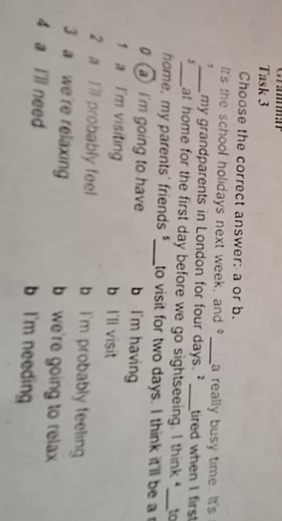 Choose the correct answer: a or b. Its the school holidays next week, and my grandparents in London for four days. 2 at home for the first day before we go sightseeing. I think home, my parents friends 0 Grammar Task 3 T a 2 a I'm going to have I'm visiting probably feel we're relaxing 4 a I'll need 15 La really busy time. It's all arranged! First of all tired when I first arrive, so Grandad say to visit for two days. I think it'll be a really exciting week! b I'm having b I'll visit b I'm probably feeling b we're going to relax b I'm needing. НА ФОТО ЗАДАНИЕ!! ДАЮ 50 БАЛЛОВ ЗА ПРАВИЛЬНЫЙ ОТВЕТ( СТАВЛЮ 100, НО ПОЧЕМУ ТО ВЫ ПОЛУЧАЕТЕ 50. ) ЖДУУ. хорошего фото нет, но есть это