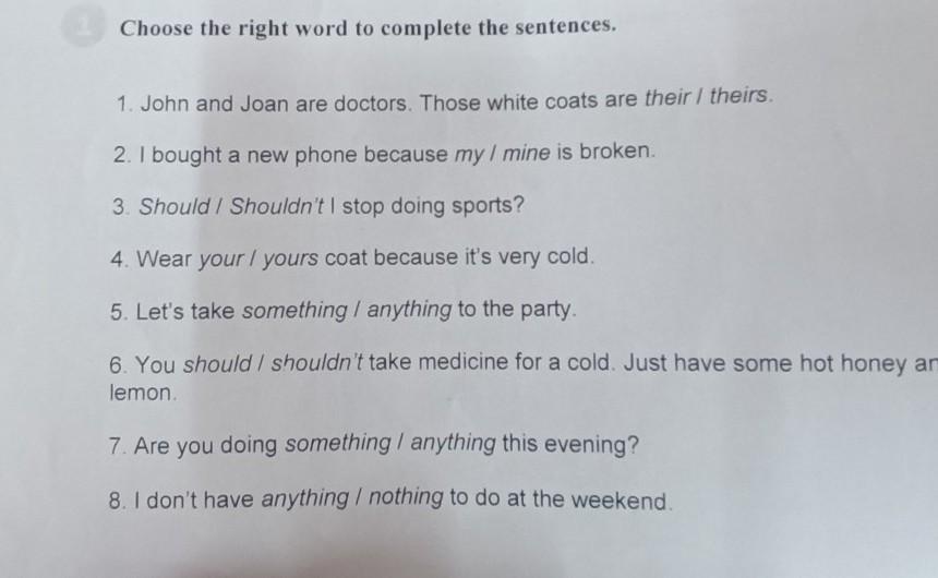 1)their 2)mine 3)should 4)your 5)something 6)shouldn't 7)something 8) nothing