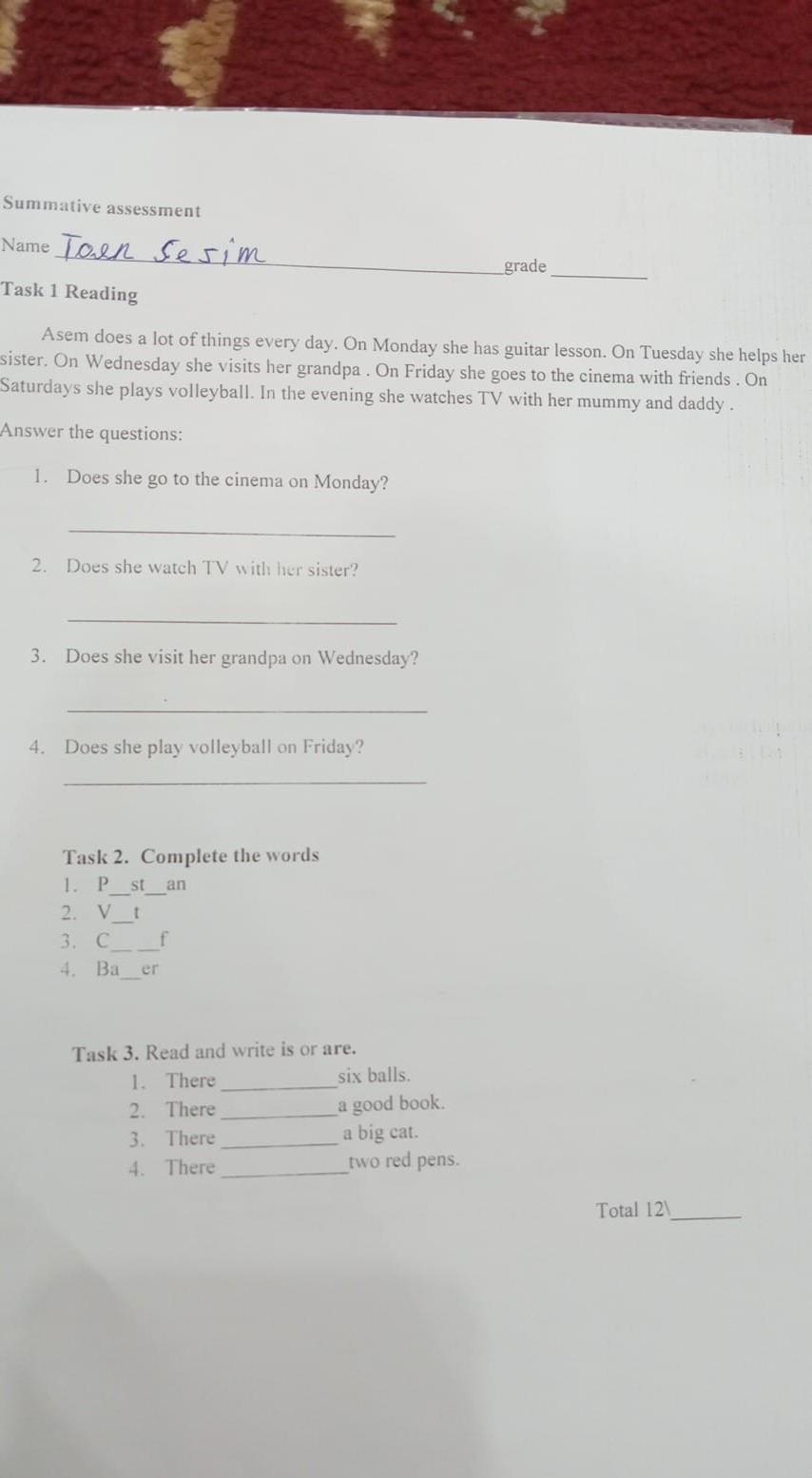 Summative assessment Name Ton Sesim Task 1 Reading Asem does a lot of things every day. On Monday she has guitar lesson. On Tuesday she he sister. On Wednesday she visits her grandpa. On Friday she goes to the cinema with friends. C Saturdays she plays volleyball. In the evening she watches TV with her mummy and daddy. Answer the questions: 1. Does she go to the cinema on Monday? 2. Does she watch TV with her sister? 3. Does she visit her grandpa on Wednesday? 4. Does she play volleyball on Friday? Task 2. Complete the words 1. P stan 2. V t 3. C f 4. Ba_er Task 3. Read and write is or are. 1. There 2. There 3. There 4. There six balls. a good book. a big cat. two red pens. grade Total 12