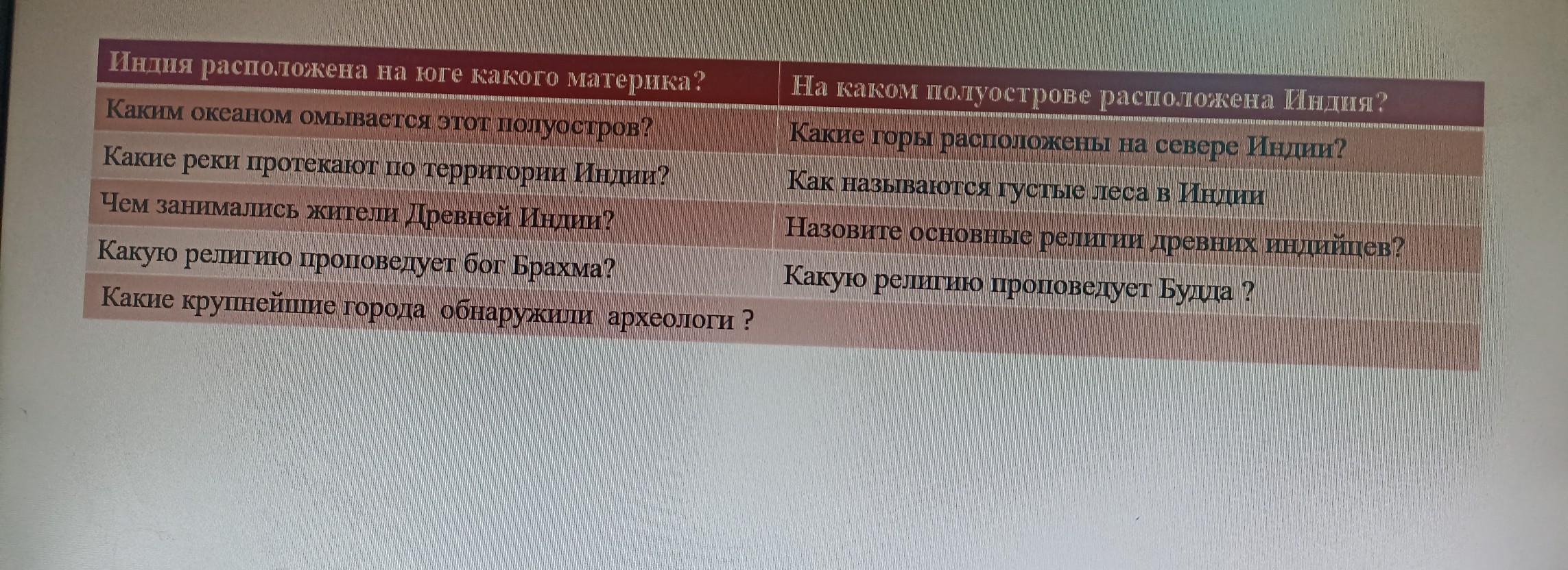 Индия расположена на юге какого материка? Каким океаном омывается этот полуостров? Какие реки протекают по территории Индии? Чем занимались жители Древней Индии, Какую религию проповедует бог Брахма? Какие крупнейшие города обнаружили археологи ? На каком полуострове расположена Индия? Какие горы расположены на севере Индии? Как называются густые леса в Индии Назовите основные религии древних индийцев? Какую религию проповедует Будда ?
