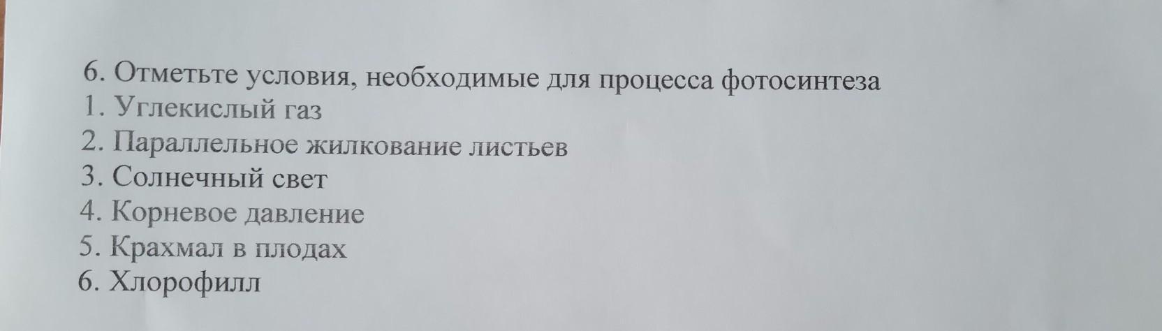 6. Отметьте условия, необходимые для процесса фотосинтеза 1. Углекислый газ 2. Параллельное жилкование листьев 3. Солнечный свет 4. Корневое давление 5. Крахмал в плодах 6. Хлорофилл