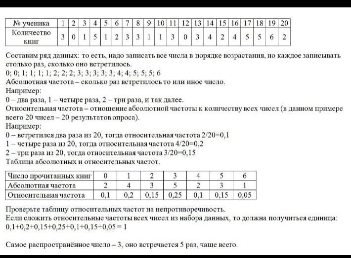 6. Социологи опросили 20 школьников, выясняя, сколько книг каждый из них прочел за прошедший месяц. Были по- лучены следующие данные: 3, 0, 1, 5, 1, 2, 3, 3, 1, 1, 3, 0, 3, 4, 2, 4, 5, 5, 6, 2 а) постройте таблицу абсолютных частот и таблицу относи- тельных частот; b) укажите самое распространенное число прочитанных книг