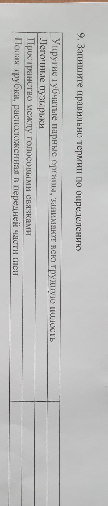 9. Запишите правильно термин по определению Упругие губчатые парные органы, занимают всю грудную полость Легочные пузырьки Пространство между голосовыми связками Полая трубка, расположенная в передней части шеи