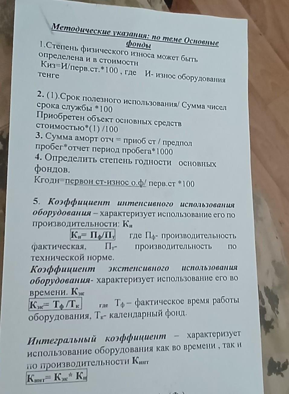 Методические указания: по теме Основные фонды 1.Степень физического износа может быть определена и в стоимостн Киз=И/перв.ст.*100, где И- износ оборудования тенге 2. (1).Срок полезного использования/ Сумма чисел срока службы *100 Приобретен объект основных средств стоимостью*(1) /100 3. Сумма аморт отч= приоб ст/предпол пробег отчет период пробега* 1000 4. Определить степень годности основных фондов. Кгодн=первон ст-износ о.ф/ перв.ст*100 5. Коэффициент интенсивного использования оборудования - характеризует использование его по производительности: Кн к - п/п, где П - производительность фактическая, пг производительность по технической норме. Коэффициент экстенсивного использования оборудования- характеризует использование его во времени. К Как-то /Тк где Тф - фактическое время работы оборудования, Т.- календарный фонд. характеризует Интегральный коэффициент ИСПОЛьзование оборудования как во времени, так и по производительности инт |Кинг Кук" * К