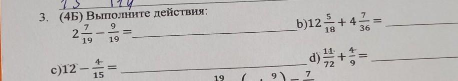 3. (46) Выполните действия: 9 T= 19 7 2. 19 - c)12-= 15 19 (п _b)12;18 + 4: 36 d) 12 + 3 = 2)-7 ||