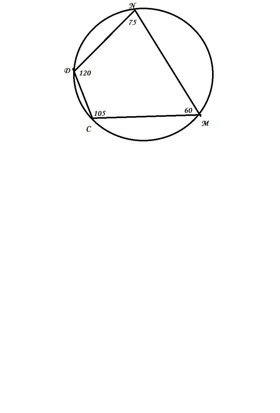Знайдіть кути C і D чотирикутника CDNM, вписаного в коло, якщо ∠N=75, ∠M=120. Тільки робити з малюнком